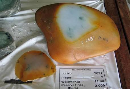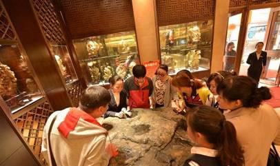 為迎八方來(lái)客七彩云南賭石世界還特意陳列了全東南亞最大的翡翠毛石——一塊名為“會(huì)卡黑砂皮“的原石:該原石長(zhǎng)寬各1.4米,高0.88米,重2.4噸,為七彩云南翡翠于1999年參加緬甸毛料公盤(pán)時(shí)耗資20萬(wàn)元賭得。作為一塊典型的“會(huì)卡”場(chǎng)口料,該原石表皮呈灰黑色,起皺,粗糙,形如象皮,看似無(wú)沙,摸著糙手,極可能內(nèi)含玻璃種、冰種翡翠,具有上等種水料的皮殼特征。從擦開(kāi)的“天窗”可以看出是一塊“半山半水”料,質(zhì)地細(xì)膩,水分充足,顏色鮮艷,專家估價(jià)已達(dá)到千萬(wàn),高者更是過(guò)億元。
