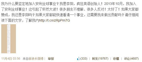 11月4日,李陽以《堅定地加入安利全球事業(yè)》為標題發(fā)出了一篇長微博,證實了他的新身份。在1000多字的文章中,李陽使用將近70個感嘆號,以其一貫的激情“瘋狂式”口號表現自己加盟直銷企業(yè)的決心。李陽稱安利的人才是“令人感動、不離不棄的真朋友”,并在用了安利產品后,“和美國太太的關系親密了”。