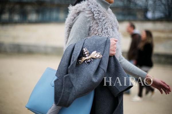 時(shí)尚潮流花蝴蝶們一定是流行的風(fēng)向標(biāo),所以從此以后大街上又會(huì)出現(xiàn)一批“胸針粉”;其標(biāo)志性特點(diǎn)就是胸針出現(xiàn)在領(lǐng)口上、圍巾上、裙子上等任何非常規(guī)位置。