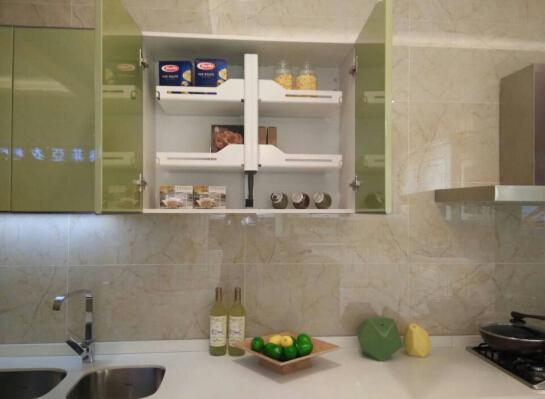 這套櫥柜有很多好的設計理念,在吊柜的設計中,一般常用的我們都是這種隔板柜的設計。操作簡單。但是他有一個弊端,上面的一層拿取物品時不是特別方便,而康潔在這塊的設計中,我們把吊柜的空間充分的利用起來,做這種智能五金件的設計。大家現(xiàn)在看到的這款是五金叫做天使降臨,他可以把我們吊柜的空間充分的利用起來,尤其是當咱們廚房的空間比較小的時候,咱們的調(diào)料、零食、干貨都可以放在吊柜里面,而且拉取輕松自然。一下子所有的物品都可以到你眼前的。