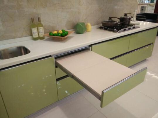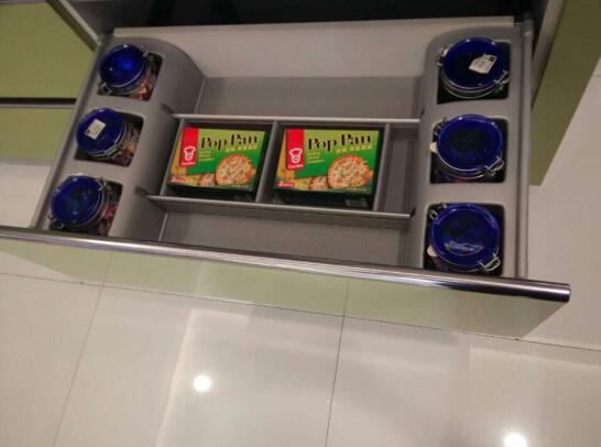 包括里面,我們也有一些這樣隔斷的設計,那么使您的物品的話可以把它卡起來,也不容易掉落。回去的時候也是特別簡單,輕輕一碰,就回去了,這個是不是也為您的生活增添了一絲靈動性呢。包括在地柜的設計中,因為這套櫥柜的整體結(jié)構(gòu)比較小一些,為了增加我們操作臺的一個使用面積,我們給他搭配了這樣的一個抽拉餐臺,這款抽拉餐臺他的承重是30斤,距離最外端是80公分的空間。如果操作的時候,操作臺不夠用的話,我們可以把他拉出來當做一個備餐區(qū)使用,回去的時候也是特別簡單,輕輕一推,就可以了。