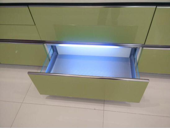 有時候手上沾上油污,不太方便的時候,我們還可以輕輕一碰,這款抽屜是帶感應式的,所有的物品不需要您彎腰,就能到您眼前,回去的時候只要輕輕一推,就可以了。整套櫥柜采用這種免拉手的設計,這種隱形拉手,使得整個門板看上去非常的流暢自如。