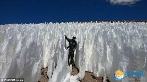 11、這種遍地冰釘?shù)淖匀黄嬗^被稱為“懺悔者”。在高海拔氣候惡劣的地區(qū),陽光照射在積雪表面上,隨機(jī)留下了凹陷痕,沒有凹陷的地方對(duì)陽光反射作用更強(qiáng),不易融化,而有凹陷的地方則會(huì)加速融化,久而久之,形成了這些冰鑄的“釘子”。