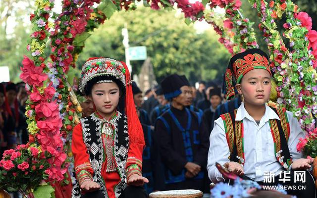 11月30日,兩名兒童乘牛車行進(jìn)在云南綠春哈尼十月年長街古宴文化旅游節(jié)游行演出隊(duì)伍最前面。