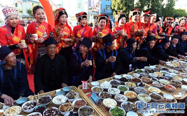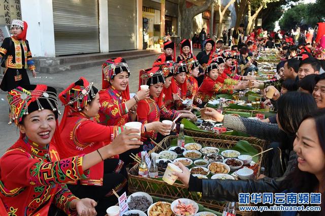 哈尼族姑娘向坐在長(zhǎng)龍宴龍頭席的哈尼山寨的長(zhǎng)老們敬酒獻(xiàn)歌