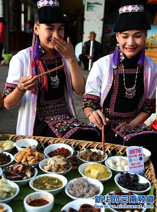 一對(duì)哈尼族雙胞胎姑娘在長(zhǎng)街宴上品嘗哈尼傳統(tǒng)美食佳肴