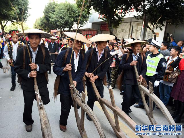 節(jié)日期間,當(dāng)?shù)毓嶙迥凶釉诮诸^扶犁游演,向游客展示古老的哈尼族高山農(nóng)耕稻作情景和古老生產(chǎn)工具