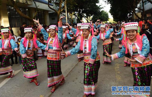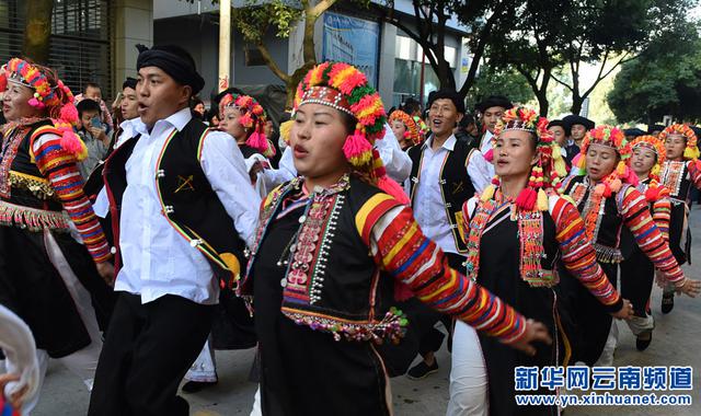 近日,聚居在云南省紅河哈尼族彝族自治州綠春縣的哈尼族群眾身著民族服飾,載歌載舞,舉行綠春哈尼十月年長(zhǎng)街宴文化旅游節(jié),與游客們共享3千米長(zhǎng)街宴,慶祝豐收年。新華社記者 陳海寧攝