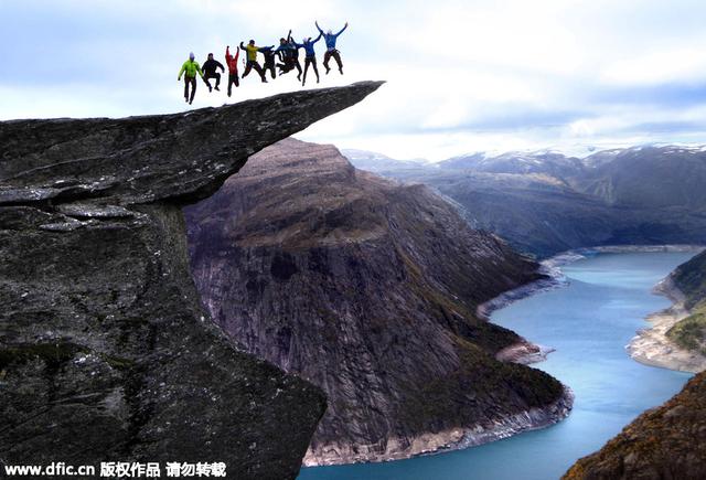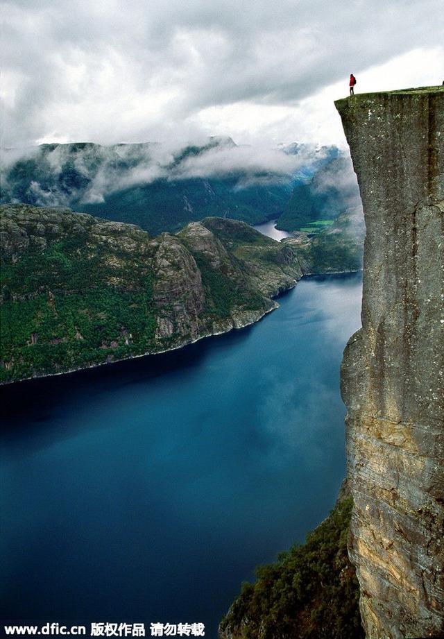 挪威“巨人之舌”,在懸崖邊緣,通過透視法,冒險(xiǎn)者們都變得十分矮小,美麗的風(fēng)景都在他們腳下。