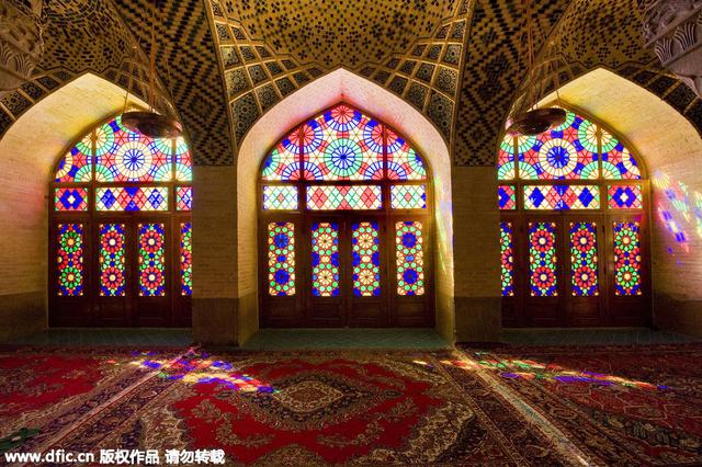 粉紅清真寺的外墻精美、繁復(fù)、艷麗的程度完全不亞于德黑蘭幾個(gè)皇宮的外墻。粉紅清真寺又被稱為莫克清真寺;關(guān)于這個(gè)花瓶的圖案是有個(gè)故事的,據(jù)說游牧民族的突厥人和阿拉伯人本身都沒有建造清真寺的技術(shù),他們攻打波斯后強(qiáng)迫波斯人為他們建造清像蜂窩一樣的立體穹頂,每一塊彩釉磚與穹頂?shù)幕《榷假N合得天衣無縫。