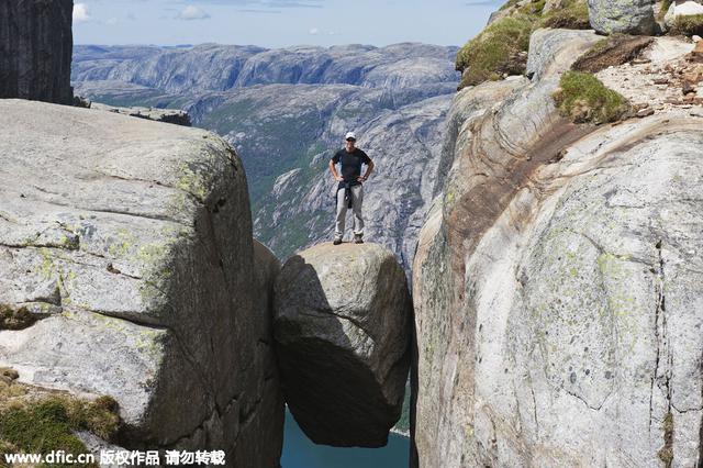 挪威“奇跡石”是挪威最負(fù)盛名的旅游景點(diǎn),這塊有5立方米大的石頭卡在絕壁間,“奇跡石”座落于挪威謝拉格山的山頂之上,距離谷底大約1000米。“奇跡石”也是一塊“勇敢者之石”,如果你有膽量爬到奇跡石上面,谷底的無限風(fēng)光便可一覽無余。