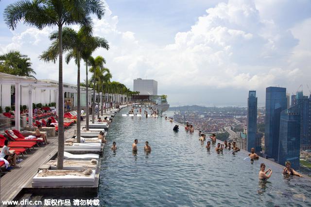 新加坡濱海灣金沙酒店空中花園里有一個(gè)特別的游泳池。乍看上去,游泳池仿佛浮在空中,沒有邊界,在里面暢游的人似乎一不留神,就會從200米高空跌落。