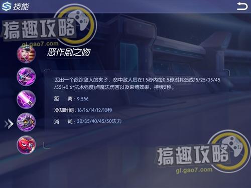 主動(dòng)技能惡作劇之吻:丟出一個(gè)跟蹤敵人的夾子,命中敵人后在1.5秒內(nèi)每0.5秒對(duì)其造成15/25/35/45/55(+0.6*AP)點(diǎn)魔法傷害以及束縛效果,持續(xù)2秒。