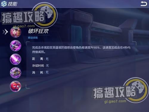 被動(dòng)技能破壞狂歡:完成擊殺或助攻英雄或防御塔會(huì)使角色移速提升100%,該速度加成會(huì)在4秒內(nèi)持續(xù)減弱。