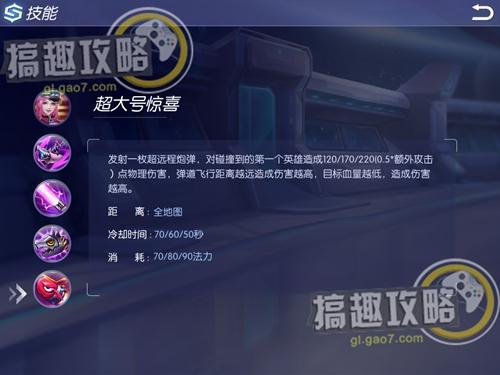 主動(dòng)技能超大號(hào)驚喜:發(fā)射一枚超遠(yuǎn)程炮彈,對(duì)碰撞到的第一個(gè)英雄造成120/170/220(0.5*額外AD)點(diǎn)物理傷害,彈道飛行距離越遠(yuǎn)造成傷害越高,目標(biāo)血量越低,造成傷害越高。