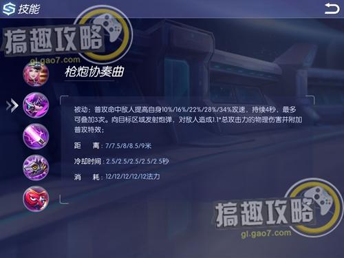 主動技能槍炮協(xié)奏曲:向目標(biāo)區(qū)域發(fā)射炮彈,對敵人造成1.1倍的普攻傷害;若命中敵人,則提高10%/16%/22%/28%/34%攻速,持續(xù)4秒,最多可疊加3次。