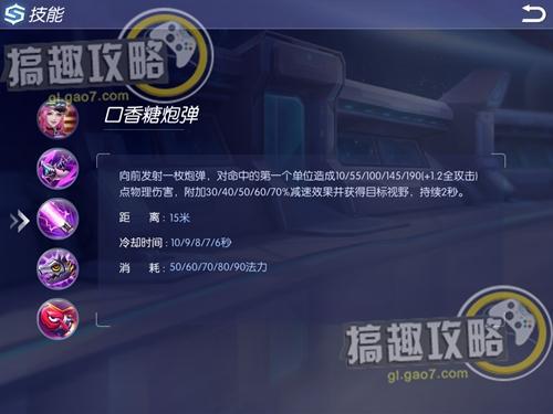 主動技能口香糖炮彈:向前發(fā)射一枚炮彈,對命中的第一個單位造成10/55/100/145/190(+1.2全AD)點(diǎn)物理傷害,附加30%/40%/50%/60%/70%減速效果并獲得目標(biāo)視野,持續(xù)2秒。