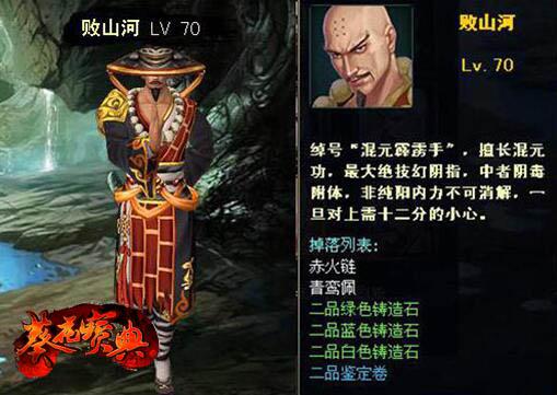 在樂趣網(wǎng)《葵花寶典》中,敗山河共有兩重省份,一是挑戰(zhàn)BOSS,一是酒館俠客。作為挑戰(zhàn)BOSS,敗山河是所有俠士前期都比較憎恨,乃至每天都想輪他一百遍的角色。主要掉落六十級(jí)首飾的合成部件,以及武林中十分珍貴的鑄造石。