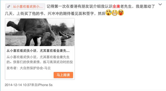 此番傳言阿里繼續(xù)擴張媒體版圖,洽購由金庸先生創(chuàng)辦的《明報》,作為金庸迷的馬云似乎與這份報紙之間的聯(lián)系早就埋下了伏筆。馬云曾多次在微博上發(fā)言,稱自己是金庸迷。而馬云在阿里的花名“風清揚”也是金庸武俠小說《笑傲江湖》中的人物。
