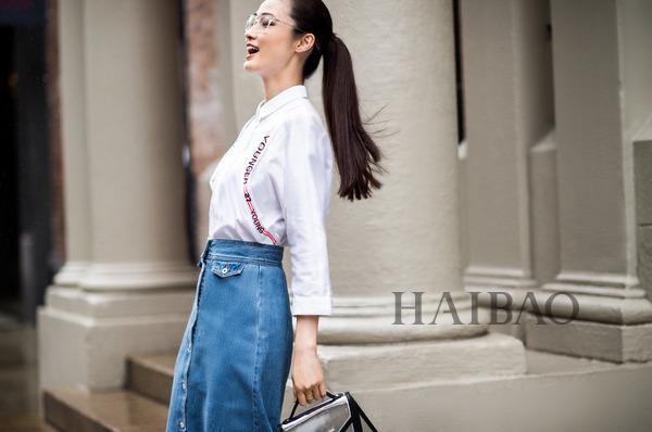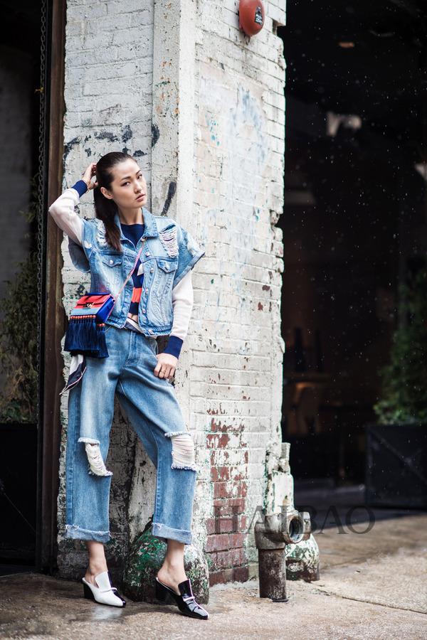 極盡個性的涂鴉印花在飽滿絢麗色彩的堆疊下變換出全新的趣味魅力,酷勁凌厲的流蘇機(jī)車夾克與卡通圖案的短裙撞擊出新的驚喜,激進(jìn)的街頭風(fēng)格在王瀟的演繹下迫不及待地釋放出堅韌新銳的時髦力量。水洗牛仔長外套、破洞牛仔背心、靛藍(lán)色牛仔襯衫……經(jīng)典硬朗的牛仔材質(zhì)借助不同工藝的打磨改造,在款式上變幻出更加灑脫并且多樣的風(fēng)格趨勢。