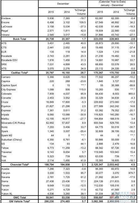 去年12月,通用汽車在美國(guó)本土零銷量同比增長(zhǎng)8.2%,共售出241,724輛,其整體銷量同比增長(zhǎng)5.7%至290,230輛。通用累計(jì)全年本土零售量2,404,484輛,同比上漲7.8%,美國(guó)整體銷量同比上漲5%至3,082,366輛。