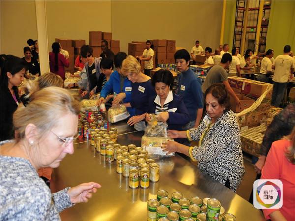 圖為參加活動(dòng)的中國駐休斯敦總領(lǐng)館人員與賑濟(jì)處工作人員一起包裝食品。