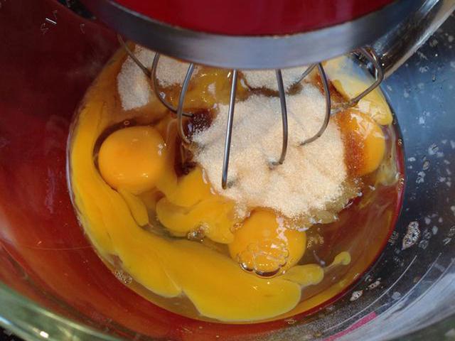 先把雞蛋、糖和香草混合攪拌到一起。