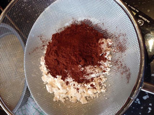 在一個碗中篩入可可粉和面粉。