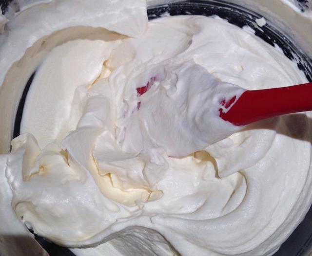 然后把為奶油部分準(zhǔn)備好的食材放進(jìn)碗里,充分?jǐn)嚢瑁旌暇鶆颉W屗鼈冞_(dá)到一個非常順滑及粘稠的狀態(tài)。
