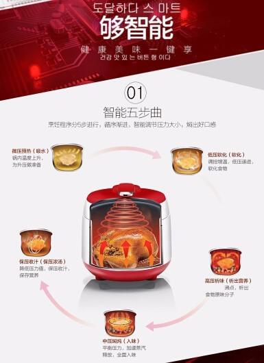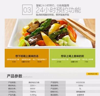 美的(midea) WSS5038 韓式方形多功能家用電腦版電壓力鍋5L,烹飪程序分5步進行,循序漸進,智能調(diào)節(jié)壓力大小,7段壓力可調(diào)4大特色功能3種口味選擇一度精控一鍵式排氣。24小時預約,韓式風格外觀設(shè)計!