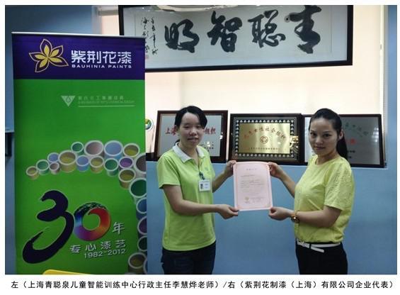 捐漆儀式上,紫荊花漆企業(yè)代表向上海青聰泉兒童智能訓(xùn)練中心捐贈(zèng)涂料,上海青聰泉兒童智能訓(xùn)練中心行政主任李慧燁老師接受捐贈(zèng),并為紫荊花漆企業(yè)代表頒發(fā)捐贈(zèng)證書,同時(shí)向紫荊花漆表示由衷的感謝。紫荊花制漆(上海)有限公司已連續(xù)三年向上海青聰泉兒童智能訓(xùn)練中心捐贈(zèng)環(huán)保涂料,不斷為孩子們提供愛心幫助。