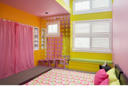 兒童房里多種鮮艷的組合,還往往具有使兒童安靜下來和表現(xiàn)的很乖的奇特效能。在孩子的眼里,沒有流行的色彩,只要是對比反差大、濃烈、鮮艷的純色都能引起他們強(qiáng)烈的興趣,也能幫助他們認(rèn)識自己所處的世界。把孩子的空間設(shè)計的五彩繽紛,不僅適合孩子天真的心理,而且鮮艷的色彩在其中會洋溢起希望與生機(jī)。對于性格軟弱過于內(nèi)向的孩子,宜采用對比強(qiáng)烈顏色,刺激神經(jīng)發(fā)育。而對于性格太暴躁的兒童,淡雅的顏色,則有助于塑造健康的心態(tài)。在裝飾墻面時,切忌用那些猙獰怪誕的形象和陰暗的色調(diào),因為這些會使幼小的孩子產(chǎn)生可怕的聯(lián)想。