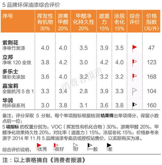 2014年11月《消費者報道》向第三方檢測機構送檢了多樂士、立邦漆、嘉寶莉、華潤漆、紫荊花漆5款主流品牌的環(huán)保油漆,對這5款產(chǎn)品進行了多項性能評測,其中紫荊花漆性價比更高。