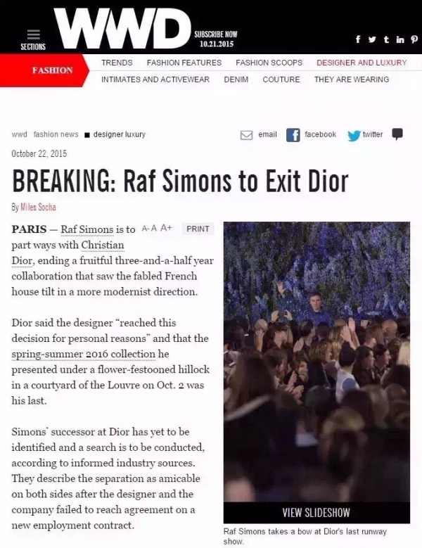 在聲明中,拉夫·西蒙 (Raf Simons)表示這是一個經(jīng)過深思熟慮后的決定,卸任Christian Dior 迪奧女裝創(chuàng)意總監(jiān)是完全基于其個人意愿的決定,他希望此后能夠?qū)W⒂诎ㄆ鋫人同名品牌在內(nèi)的其它興趣。同時,他也感謝Bernard Arnault和Sidney Toledano給予自己的信任和支持,很榮幸曾有機(jī)會和如此優(yōu)秀的團(tuán)隊(duì)合作。自此,2016春夏系列成了拉夫·西蒙 (Raf Simons)的Dior謝幕秀。
