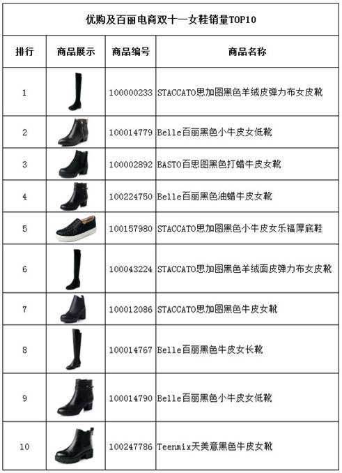 優(yōu)購及百麗電商精選銷量TOP10的男女鞋靴單品。