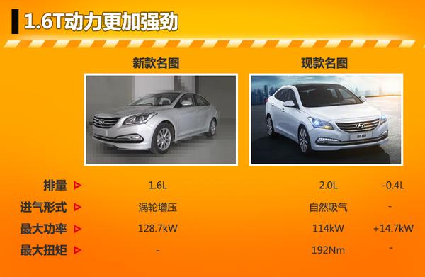 北京現代現款名圖提供1.8L和2.0L兩種動力選擇,與兩款發(fā)動機匹配的變速器有6速手動變速器和6速手自一體變速機。其中2.0L自然吸氣發(fā)動機最大功率114kW,名圖將搭載的1.6T渦輪增壓發(fā)動機在最大功率輸出方面超越現款名圖搭載的兩款自然吸氣發(fā)動機,動力表現更加出色。名圖搭載1.6T發(fā)動機后有望得到更多消費者的青睞。