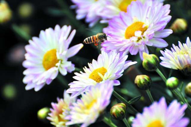 紫色、黃色、白色……4.5萬盆菊花等花卉匯成五顏六色的花海,徜徉其中,盡是幽然清香,引人沉醉。蜜蜂、蝴蝶也聞香而至,忙碌著在花叢中采吸蜜汁,也成了菊景錦上添花的點(diǎn)綴。
