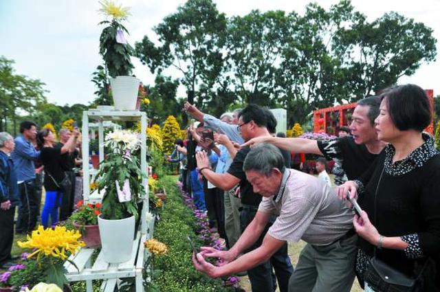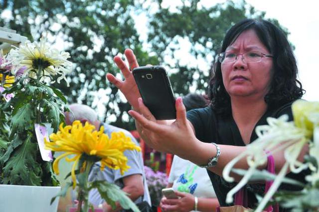 美景于前,游客們?nèi)滩蛔√统鍪謾C(jī),與家人朋友合影。攝影愛好者也帶著“長槍短炮”,對著花兒“狂轟濫炸”。楊伯退休后就迷上了攝影,每年的菊花展覽都成為老人家一顯身手的好時(shí)機(jī)。長焦、微焦鏡頭一應(yīng)俱全,設(shè)備絲毫不遜于專業(yè)攝影者。楊伯說,他逮著周末天氣晴好便外出走走,也借機(jī)留下這些美麗花兒的身影,以后沒事在家就能打開圖片欣賞。