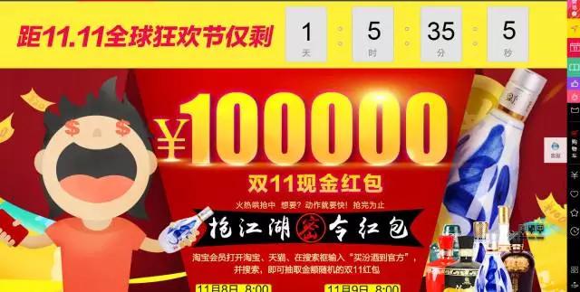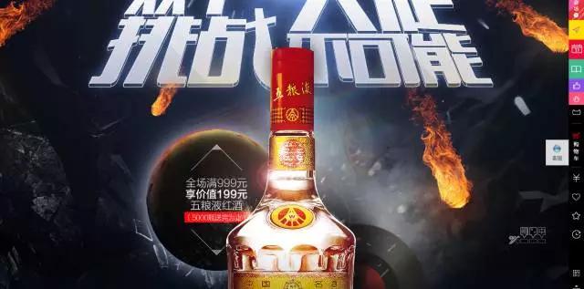 相對于茅臺的低調(diào),五糧液的活動可謂是精心準(zhǔn)備。提出“雙十一大促,挑戰(zhàn)不可能”的口號,折扣也是不低。全場滿999元,享價值199元的五糧液紅酒(5000瓶送完為止)。還有四大活動助力雙十一:活動一:低價:52度五糧液熊貓酒500ml 到手799元。活動二:品牌團即在聚劃算上團購秒殺1元五糧液亞洲干紅葡萄酒,52度五糧液水晶瓶500ml659元。活動三:絕版限量專區(qū)。活動四:玩游戲得紅包。