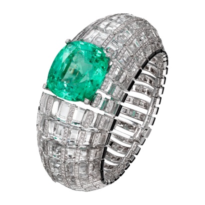 CLARTE。這件精美手鐲中央鑲嵌一顆璀璨寶石,攝人心魄:一顆重66克拉的哥倫比亞祖母綠,擁有被稱為“花園景象”的細膩內含物,明艷動人。卡地亞的珠寶師搭配運用枕形切割天然水晶和長方形鉆石,營造出深邃靈動的立體效果。這得益于微妙細膩的寶石間隔,其優(yōu)雅輕盈的鑲嵌工藝更帶來奇妙的視覺享受。