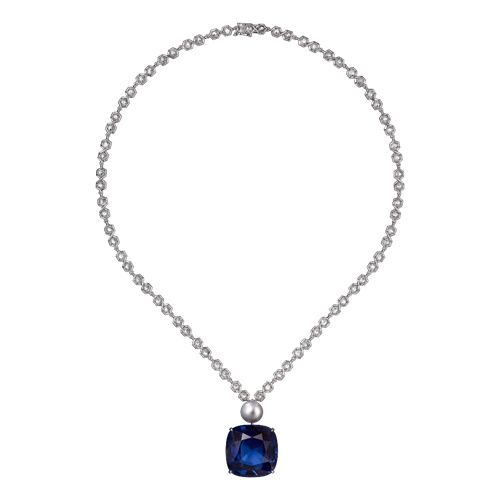 Andaman項鏈,鉑金,1顆重44.47克拉的階梯式切割枕形藍寶石,1顆重20.40格令的淡灰色天然珍珠,玫瑰形切割鉆石,重4.22克拉,明亮式切割鉆石。