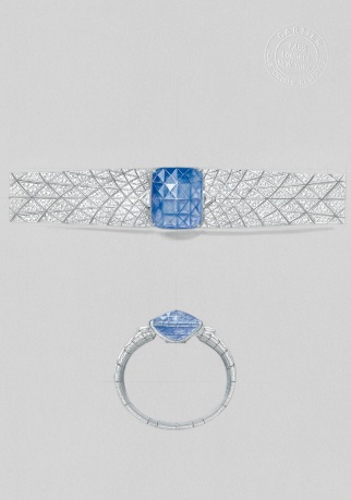 藍寶石在卡地亞手上再現(xiàn)奪目風采。這顆重達197.80克拉的錫蘭藍寶石以其稀世的體積、傳奇的歷史和無與倫比的美感,令人為之傾倒。如今,這顆色彩明艷的枕形切割寶石被鑲飾于一枚手鐲中央,秉承卡地亞的兩大經(jīng)典設計風格——簡約線條與幾何圖案,成為一件瑰麗臻品。中央藍寶石可拆卸并替換為一顆天然水晶。
