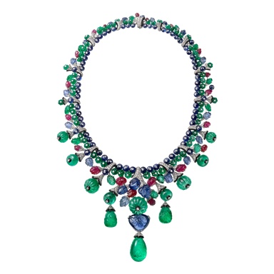 AGRA項鏈, 鉑金,雕刻哥倫比亞祖母綠重37.37克拉,2顆雕刻水滴形雕刻祖母綠共重 40.98 克拉,三角形雕刻藍寶石重24.13克拉,瓜形切割祖母綠,藍寶石珠,祖母綠珠,雕刻藍寶石,雕刻紅寶石,雕刻祖母綠,凸圓形切割紅寶石,凸圓形切割藍寶石,縞瑪瑙,明亮式切割鉆石。4顆雕刻中心寶石可移除,單獨佩戴成項鏈。