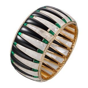 CHROMIE。純凈通透的天然水晶與光滑深邃的縞瑪瑙在這枚手鐲臻品上相映成輝;卡地亞巧妙搭配材質和色彩元素,賦予其別具一格的風情。黑與白的撞色設計、鑲飾祖母綠的黃金底座,抽象的幾何線條與大膽的配色為路易·卡地亞(Louis Cartier)于20世紀末所開創(chuàng)的現(xiàn)代風格賦予全新面貌。