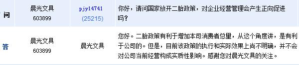 全景網11月20日訊 晨光文具(603899)周五在全景網互動平臺上表示,國家二胎政策有利于增加公司消費者總量,從這個角度講是有利于公司的。但是,目前該政策的執(zhí)行和實際效果上尚不明確,并不會對公司當前經營構成實質性影響。