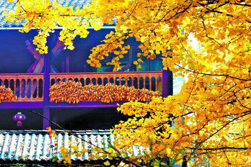 秋天里,能想到的最愜意的事,大概就是在這個(gè)極邊的小村里,選一個(gè)陽光明媚的下午,找一個(gè)有銀杏樹的院子,坐在一把小木椅上,喝一杯清茶,吃一盤松子,看四周金色的葉子簌簌地落。而每年銀杏紛飛的時(shí)節(jié),也是這個(gè)小村子最熱鬧的時(shí)候。最難能可貴的是,游人的紛擾,并沒有讓這里變得太過“商業(yè)化”,村民們還保留著原有的淳樸和熱情。你可以看見村民散養(yǎng)的小雞在落葉上踱步,犁田的老牛臥在樹下小憩,還可以看到老屋的墻頭曬著村民的衣服。