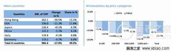 所有價(jià)格段的鐘表產(chǎn)品都未能幸免。出口價(jià)格低于200瑞郎(出口量-7.2%,出口額-10.5%)和500至3,000瑞郎之間(出口量-7.1%,出口額-8.2%)的產(chǎn)品下降不甚明顯,但仍然不容忽視。出口價(jià)格200至500瑞郎(出口量-13.0%,出口額-13.2%)和高于3,000瑞郎(出口量-16.1%,出口額-14.3%)的產(chǎn)品出口量和出口額下跌幅度都超過(guò)了13%。