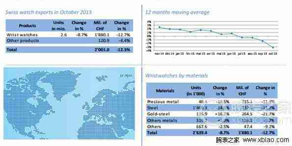 精鋼表和貴金屬表為十月份瑞士鐘表出口變化定下基調(diào),二者出口額下降了12%,出口量的下滑幅度則更加明顯(分別為-18.5%和-14.3%)。受到精鋼表拖累,十月份瑞士鐘表出口總量大度下跌。精鋼間金表(出口量+16.2%)和其他金屬表(出口量+1.0%)雖有積極表現(xiàn),但難以挽回大局。