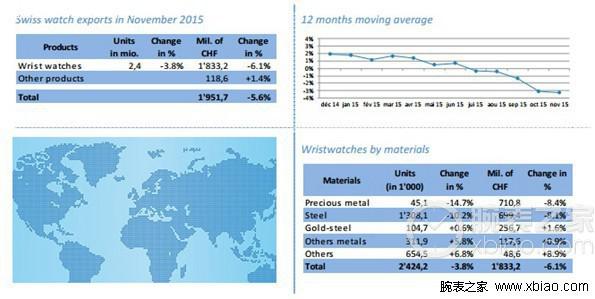 不同材質(zhì)腕表方面,就出口額來(lái)看,貴金屬腕表(-8.4%)和精鋼腕表(-8.1%)的下滑幅度雙雙超出平均水平(-6.1%),其他材質(zhì)腕表出口額相比2014年11月均有不同幅度的上升。就出口數(shù)量來(lái)看,精鋼腕表(-10.2%)下跌影響重大,其他金屬腕表(+5.8%)和其他材質(zhì)腕表(+6.8%)雖有積極表現(xiàn),但難以挽回大局。