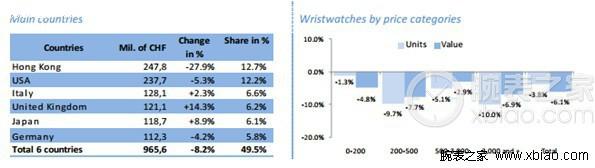 無(wú)論出口額亦或出口數(shù)量,所有價(jià)格段的腕表產(chǎn)品均未能錄得積極發(fā)展。這其中,又以出口價(jià)格介于200至500瑞郎之間(出口量-9.7%,出口額-7.7%)和高于3,000瑞郎(出口量-10.0%,出口額-6.9%)的產(chǎn)品跌幅最為顯著。